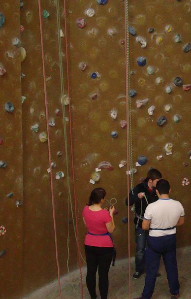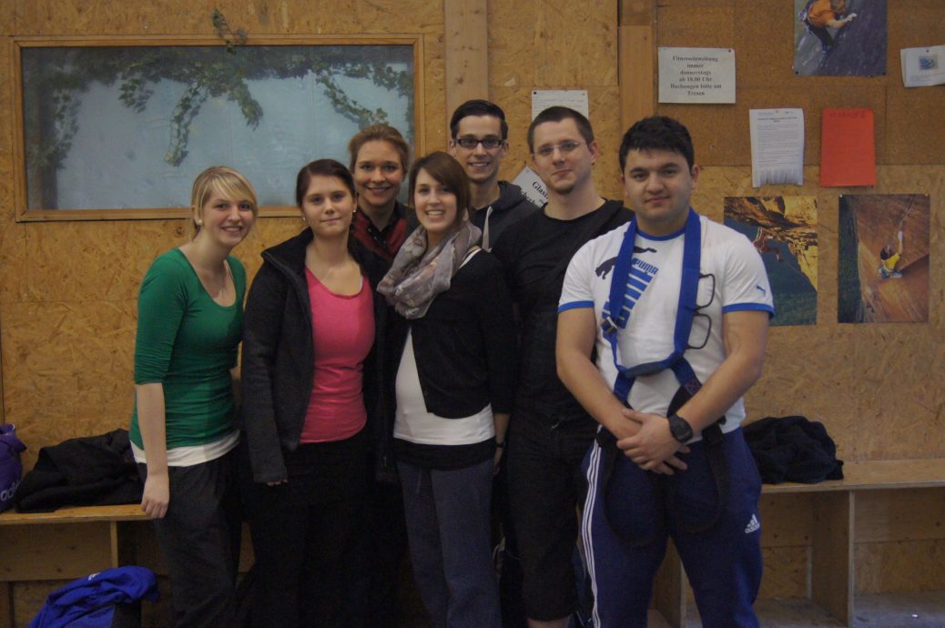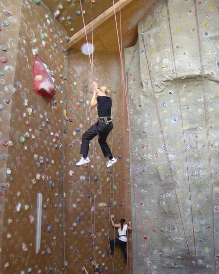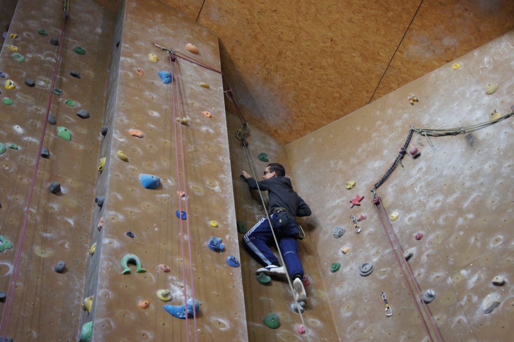 Unten in der Kletterhalle haben wir unsere Tagesaufgabe erfahren. Ein Schild mit dem eigenen Namen wurde an eine bestimmte Stelle der Kletterwand geklebt. Wir mussten selbst einschätzen, welche Höhe wir im Laufe des Tages erzielen könnten. Als dieser Vorgang abgeschlossen war, wurden wir in Teams von vier Personen eingeteilt und durften mit dem Klettern beginnen. Jedes Team hatte einen Teamtrainer, der uns allen gezeigt hat, wie wir uns selbst und den Partner richtig sichern. Anschließend durften wir unter Aufsicht des Teamtrainers die Wand hochklettern. Er prüfte sicherheitshalber der die ganze Zeit, ob wir noch richtig gesichtert sind.