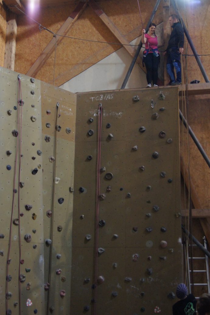 Nun wartete auf  Freiwillige eine ganz besondere Aufgabe: Nachdem wir 6-7 Meter an einer Wand hoch geklettert sind, mussten wir uns in ein Seil fallen lassen. Dies ist einfacher gesagt als getan! Als man sich oben umgedreht und einen kurzen Blick in den Abgrund geworfen hat, bekam man schon ein sehr mulmiges Gefühl in der Magengegend. Es gab keinen anderen Weg zurück, als sich einfach fallenzulassen. Dies hat uns an diesem Tag die größte Überwindung gekostet. Aber man konnte unten mit Stolz sagen: „Ich habe es geschafft!“ Und das gratis mitgelieferte Glücksgefühl dazu, war besser als nach jeder Tafel Schokolade!